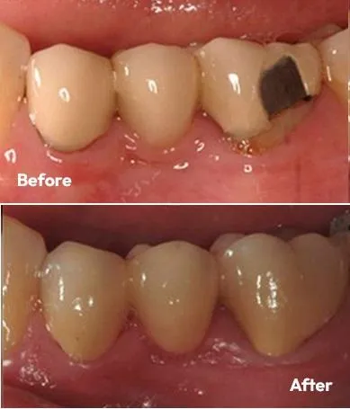 A dental implant is an artificial root made of titanium metal that serves as a substitute for the root of a missing tooth. The top of the implant is attached to an artificial tooth (crown), resulting in a beautiful natural-looking replacement tooth.